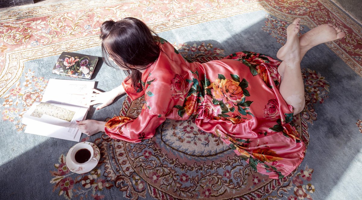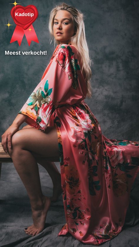 Kimono Santorini Coral Wild Roses gemaakt van heerlijk satijn lang model